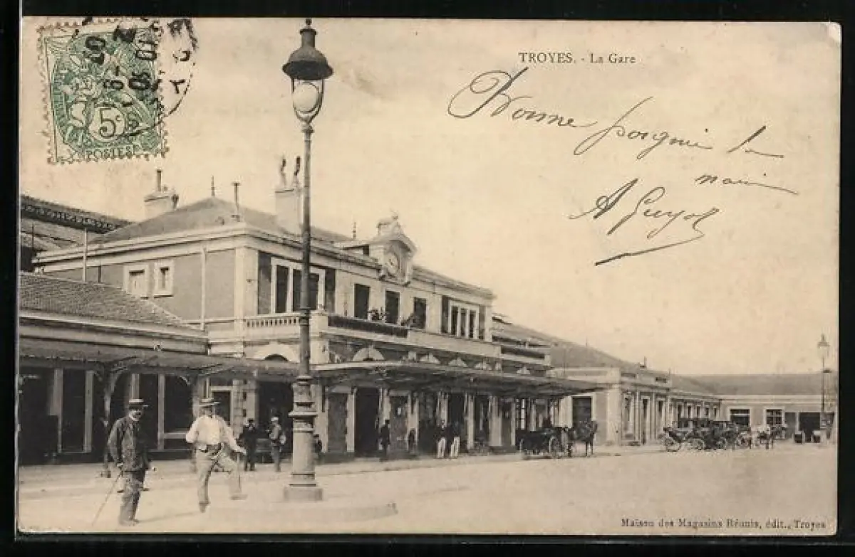 AK Troyes, La Gare avec des passants et une voiture à cheval