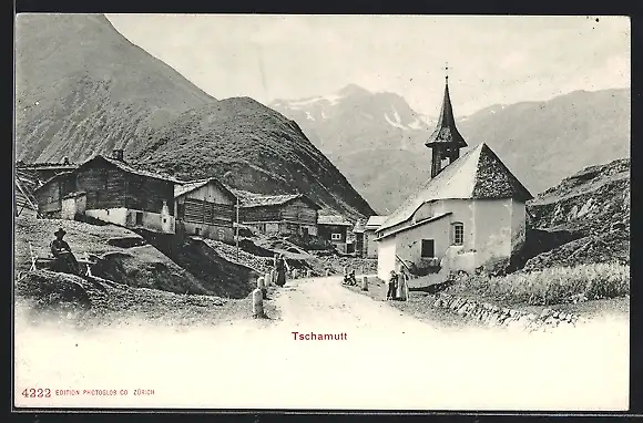 AK Tschamutt, Strassenpartie mit Kirche
