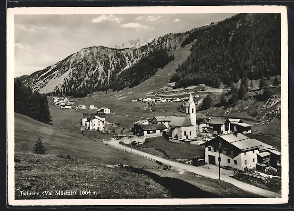 AK Tschierv /Val Müstair, Strassenpartie mit Kirche