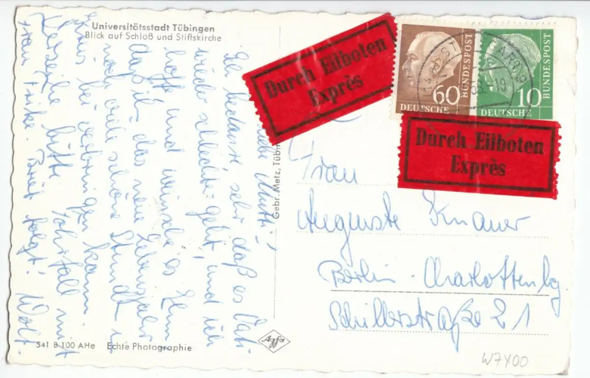 postalisch gelaufen, gestempelt: (14a) Stuttgart 9, 24.7.58