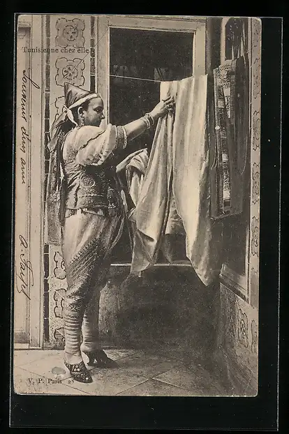 AK Tunesierin zu Hause beim Wäschaufhängen
