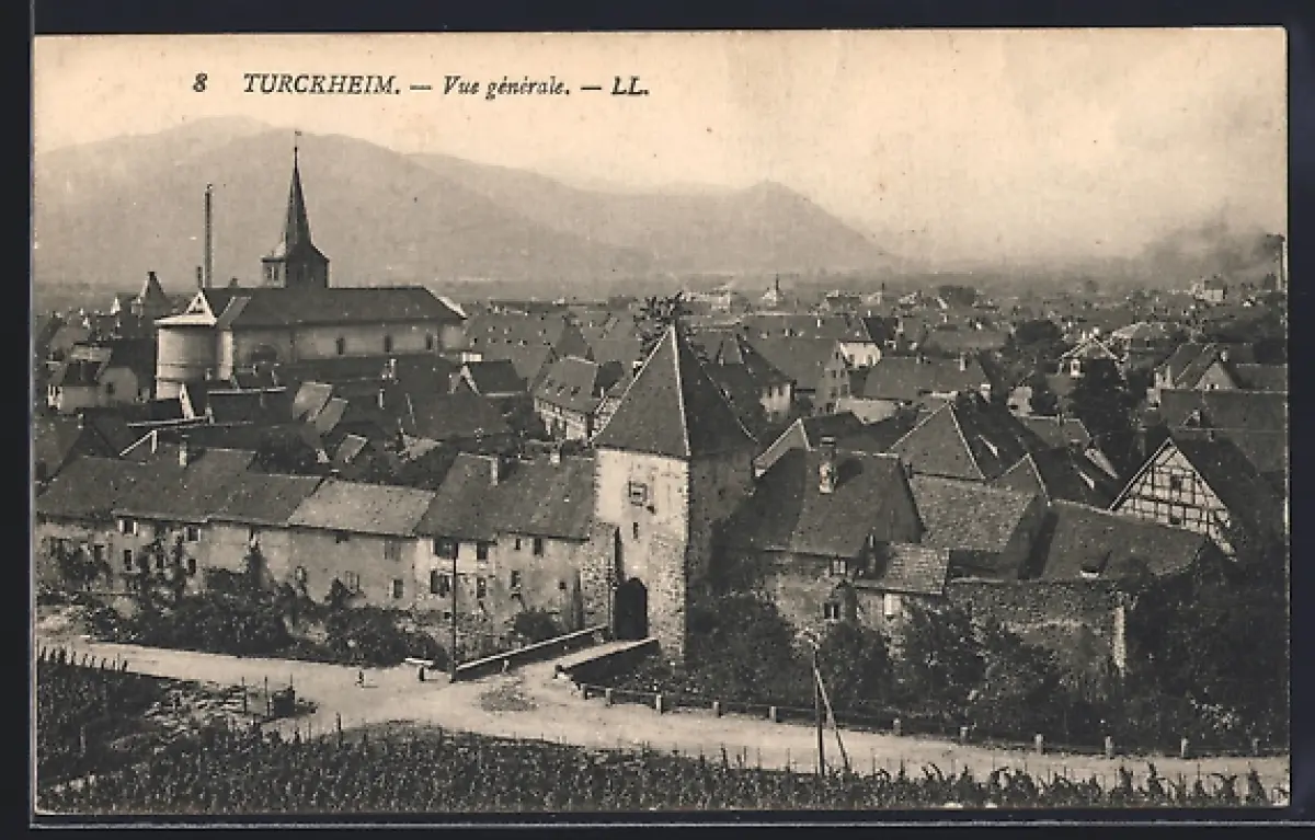 AK Turckheim, Vue générale du village avec église et montagnes en arrière-plan