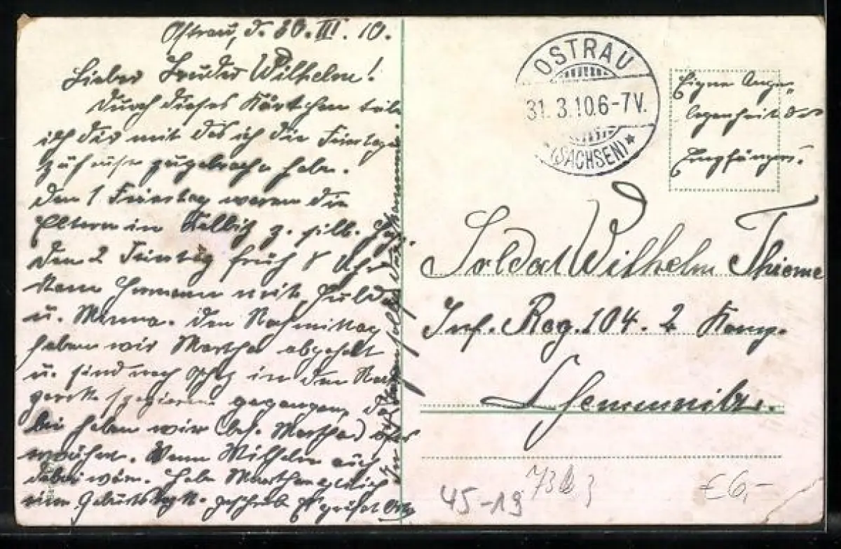 Personenbezogene Daten auf der Rückseite der Karte wurden durch blauen Textmarker unkenntlich gemacht. Die blauen Stellen sind auf die Vorderseite durchgeweicht und wirken sich negativ auf das Postkartenfoto aus