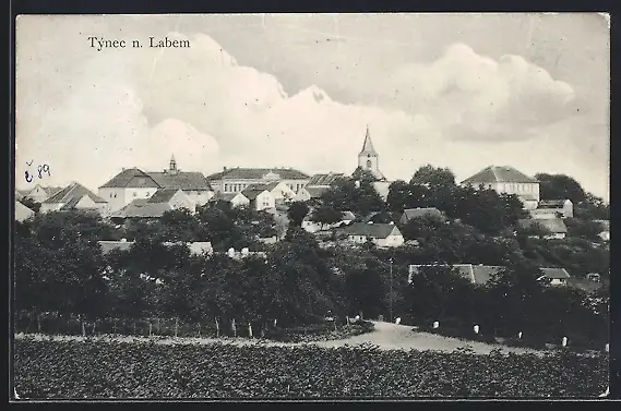 AK Tynec nad Labem, Ortseingang mit Blick Richtung Kirche, Strasse