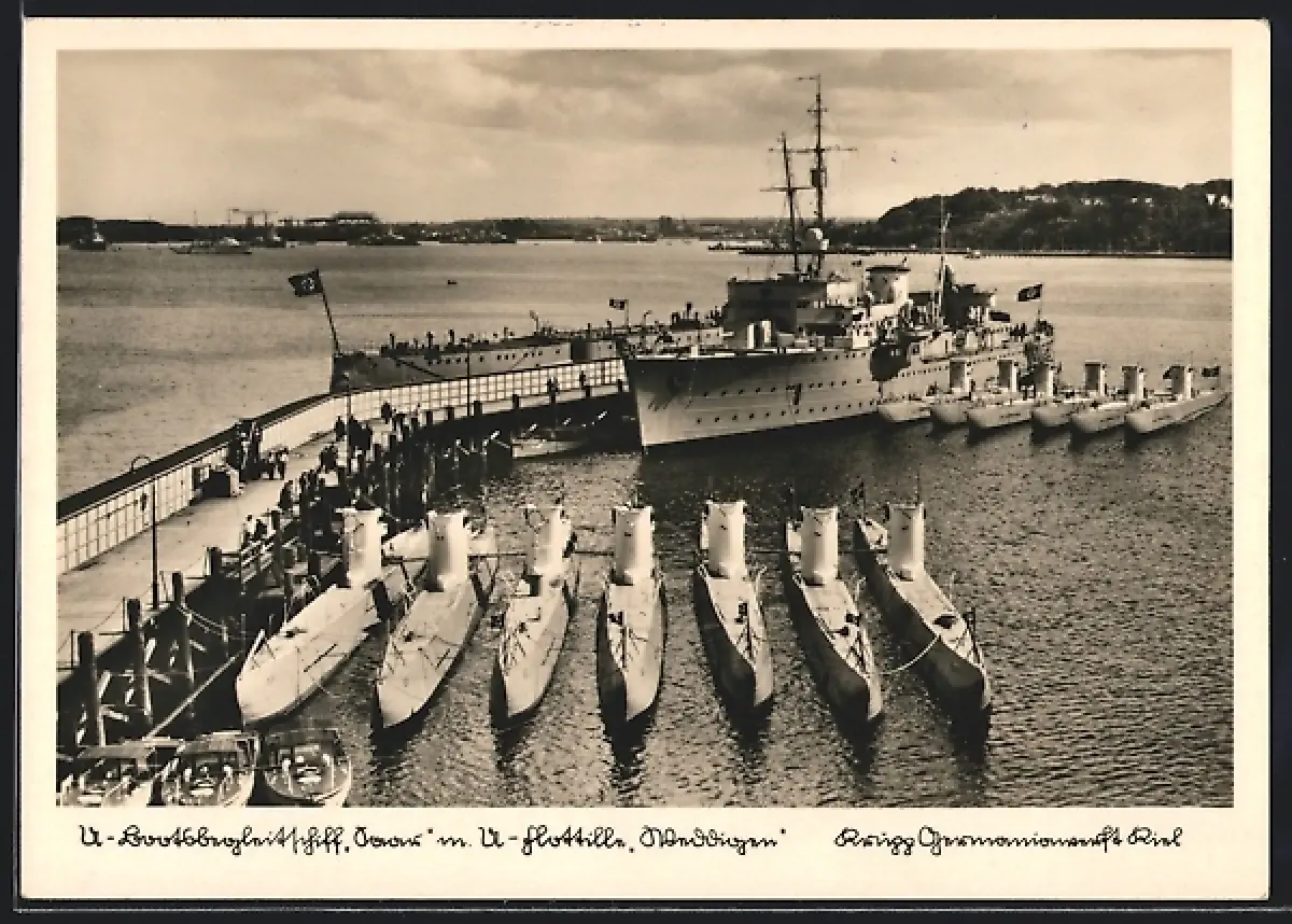 AK U-Boot-Begleitschiff Saar mit U-Booten der U-Flottille Weddigen der Kriegsmarine