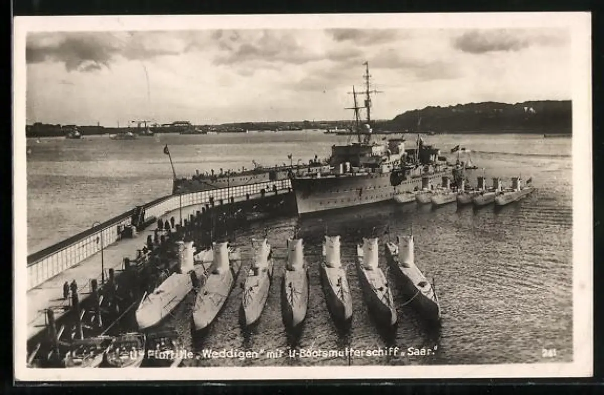 AK U-Flottille Weddigen mit U-Bootsmutterschiff Saar, U-Boot, Kriegsmarine
