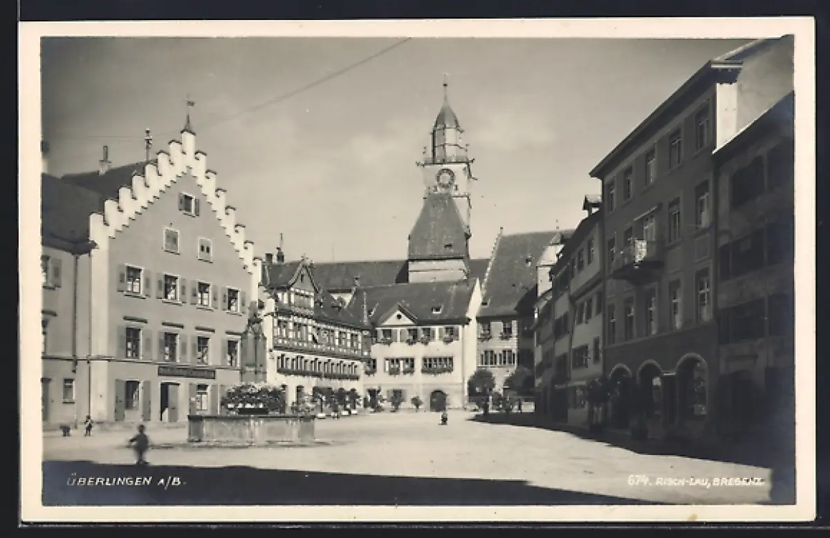 AK Überlingen a. B., Ortspartie mit Brunnen und Turmgebäude