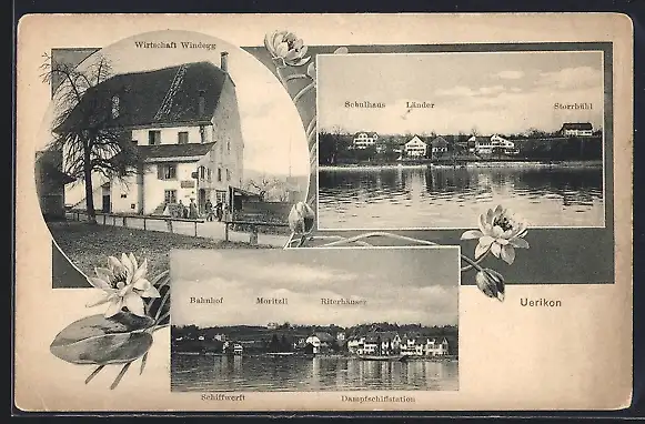 AK Uerikon, Gasthaus Windegg, Teilansicht mit Bahnhof, Moritzli und Schiffwerft