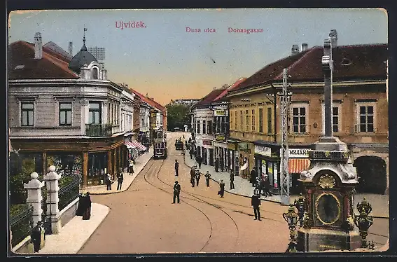 AK Ujvidek, Duna ucta, Donaugasse mit Geschäften, Strassenbahn