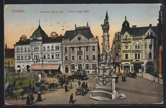AK Ujvidék, Ferencz József tér, Franz Josef-Platz mit Geschäften, Strassenbahn