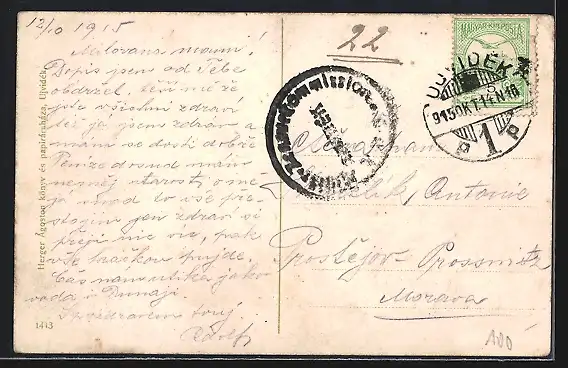 gelaufen 1915, Eckknick u. Abriebspur oben li., Stempelspur, guter Zustand