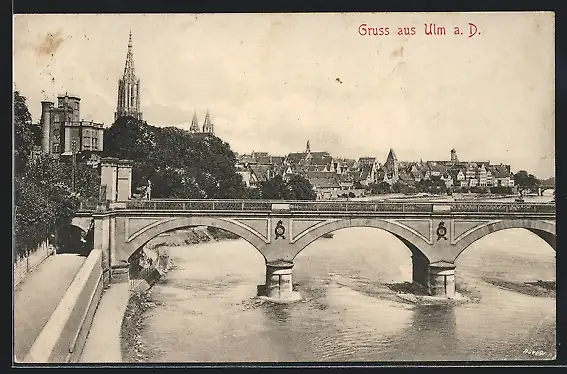 AK Ulm / Donau, Teilansicht mit Flussbrücke