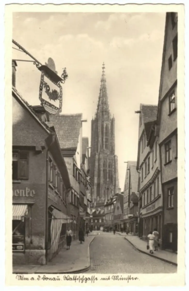 Ansichtskarte Ulm Donau Walfischgasse mit Münster Erhaltung I-II, Text geschwärzt postalisch gelaufen, gestempelt: (14a) Ulm (Donau) 1, 27.5.49 Karte wahrscheinlich von vor 1945 Verlag: Karl Balkheimer, Ulm