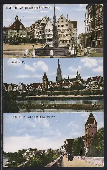 AK Ulm a. D., Brunnen auf dem Marktplatz, Stadtblick mit dem Münster, auf der Stadtmauer