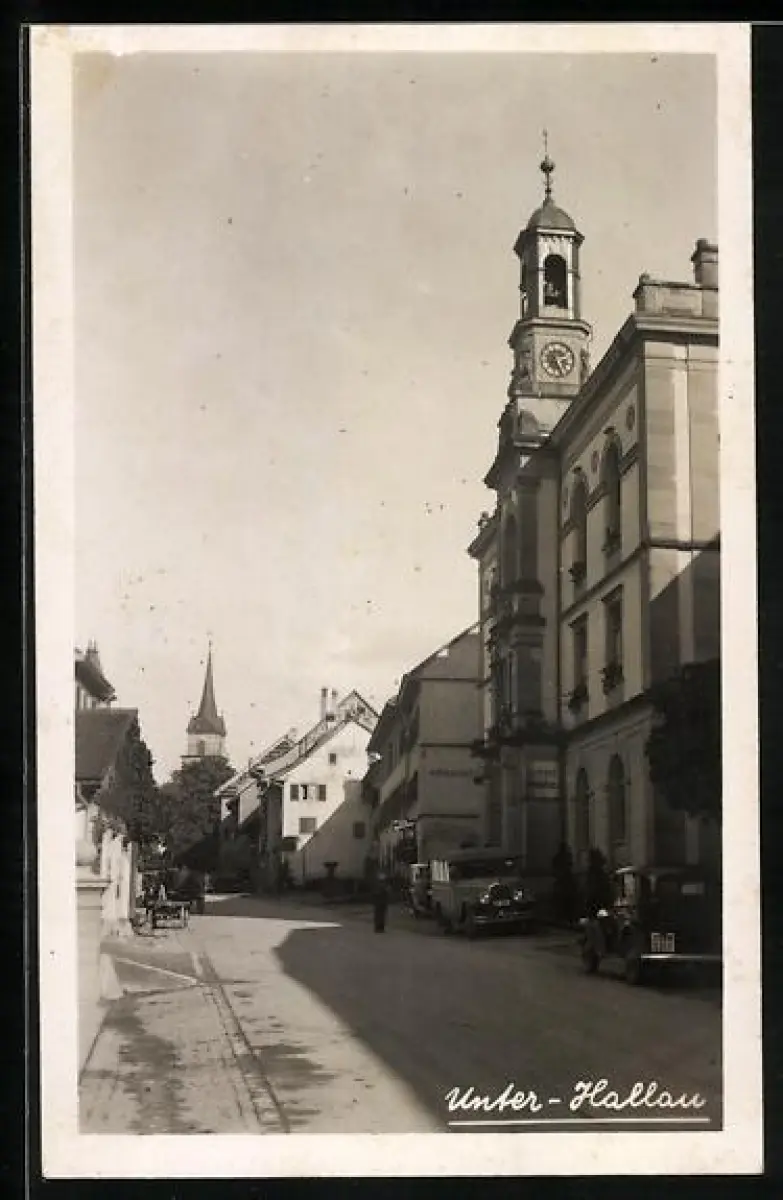 AK Unter-Hallau, Strassenpartie mit Gasthaus und Kirche, Uhrenturm