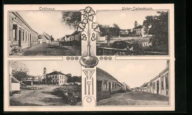 AK Unter-Siebenbrunn, Strassenpartie mit Geschäft, Ortspartie mit Kirche, Strassenpartie mit Gebäudeansicht