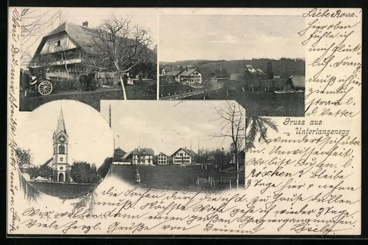 AK Unterlangenegg, Ortsansicht vom Feld aus, Kirche, Ortspartie mit Wohnhäusern