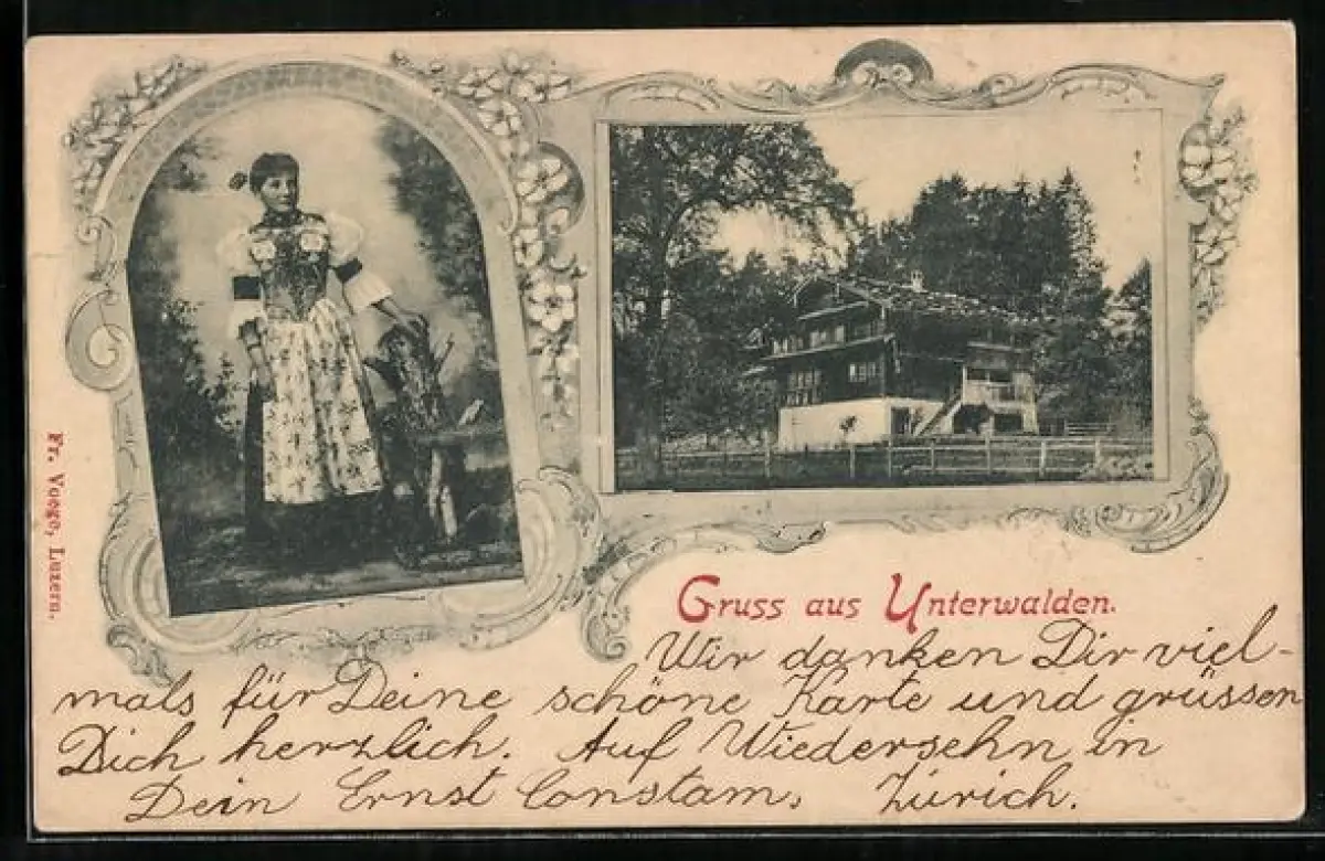 AK Unterwalden, Unterwaldner Haus, Frau in Tracht
