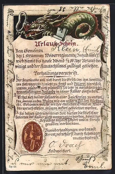 AK Urlaubsschein eines Weiberregiments mit Verhaltensvorschriften, Drachen