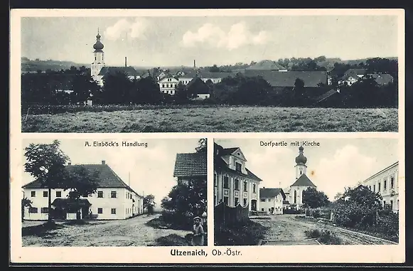 AK Utzenaich, A. Einböck`s Handlung, Dorfpartie mit Kirche, Ortsansicht