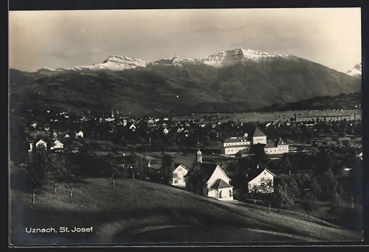 AK Uznach, Blick zur Kirche St. Josef, Ortsansicht aus der Vogelschau
