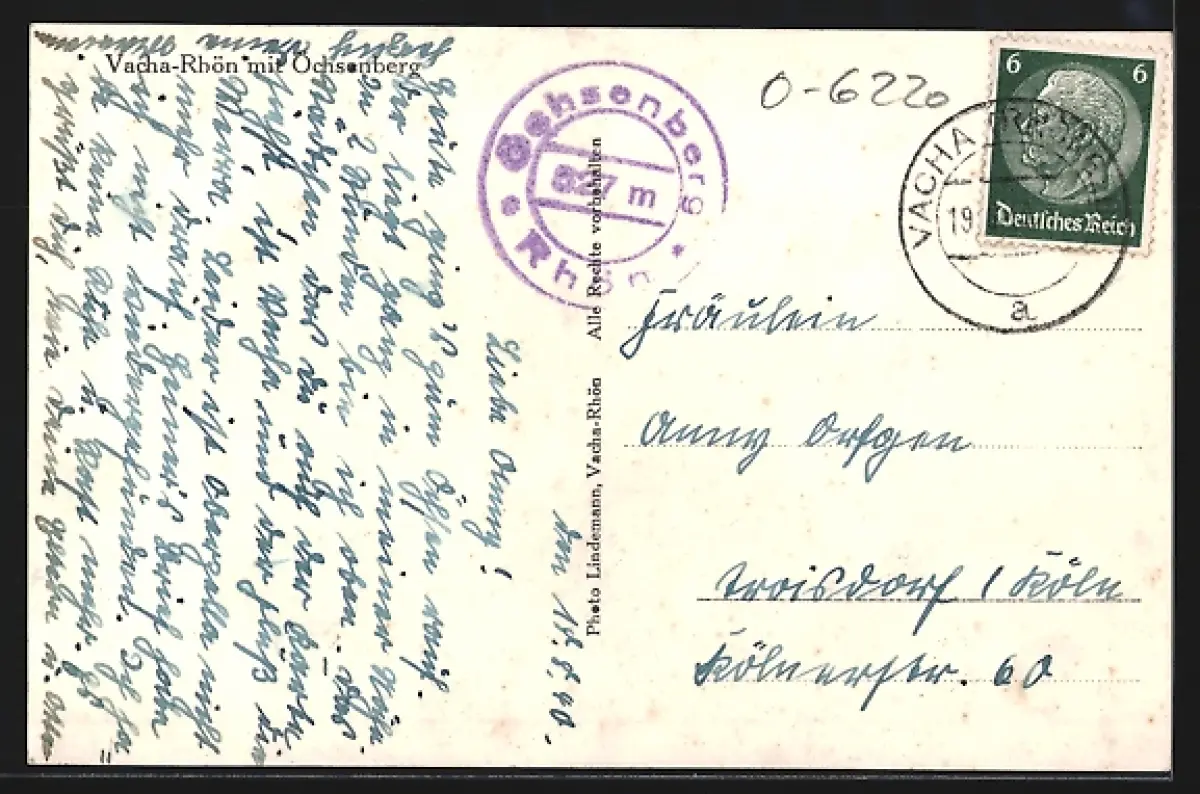 Personenbezogene Daten auf der Rückseite der Karte wurden durch blauen Textmarker unkenntlich gemacht. Die blauen Stellen sind auf die Vorderseite durchgeweicht und wirken sich negativ auf das Postkartenfoto aus