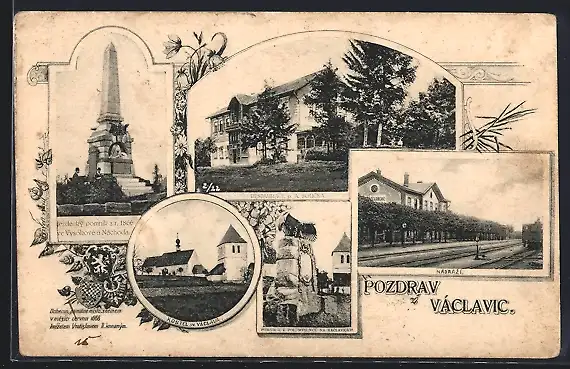 AK Vaclavice, Restaurace p. A. Soucka, Nadrazi, Kostel sv. Vaclava