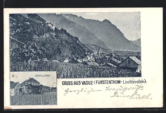 AK Vaduz, Gasthaus zum Löwen, Ortsansicht mit Kirche