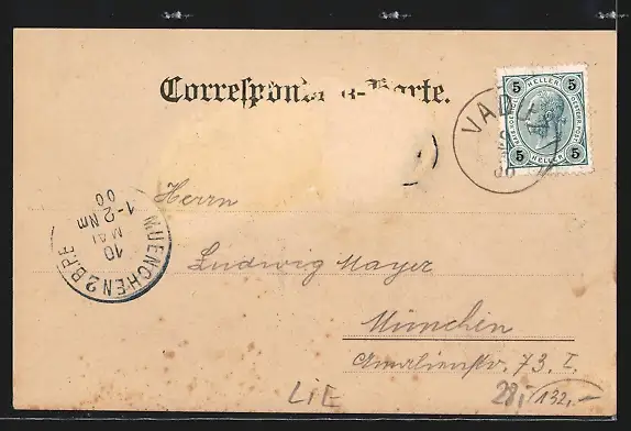 alte Ansichtskarte, gelaufen 1900, rückseitig Oberflächenschaden, guter Zustand