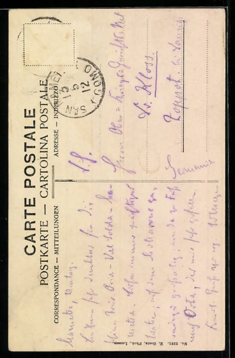 alte Ansichtskarte, gelaufen, Briefmarke entfernt, rückseitig Oberflächenschaden, guter Zustand