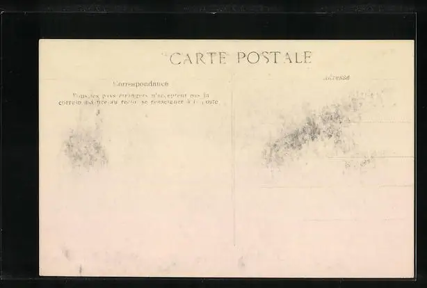Personenbezogene Daten auf der Rückseite der Karte wurden durch blauen Textmarker unkenntlich gemacht. Die blauen Stellen sind auf die Vorderseite durchgeweicht und wirken sich negativ auf das Postkartenfoto aus