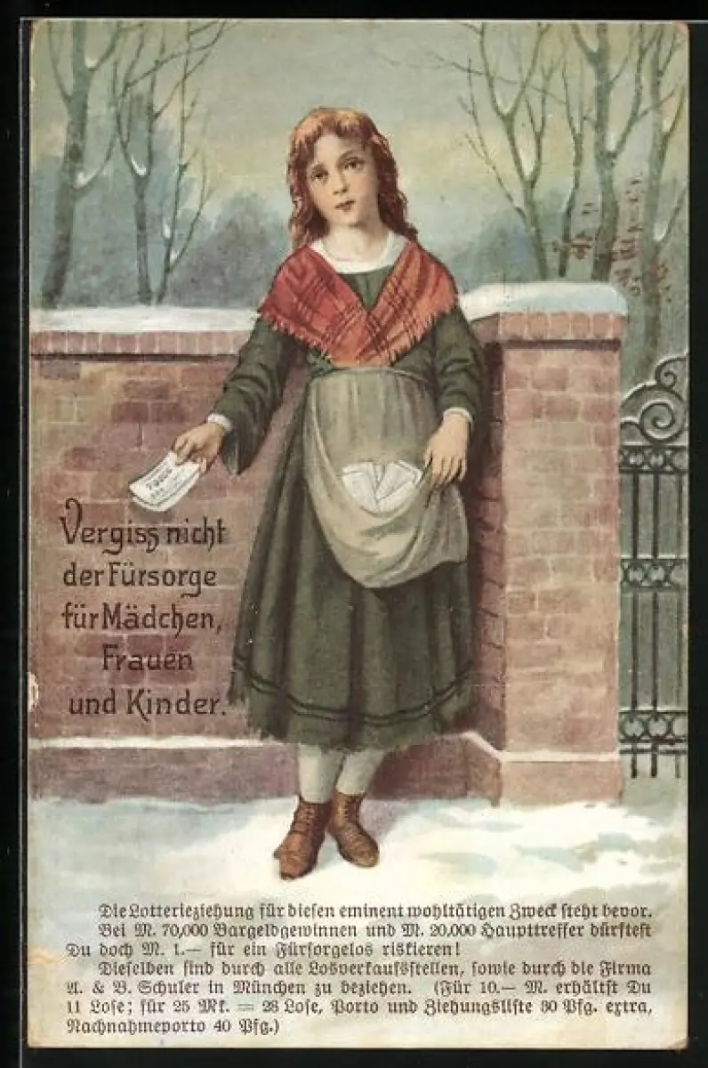 AK Vergiss nicht der Fürsorge für Mädchen, Frauen und Kinder, Mädchen verkauft Lotterielose bei Eis und Schnee