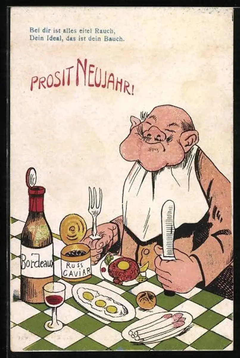 AK Vergnügter Geniesser beim Festmahl mit Wein und Kaviar, Neujahrsgruss