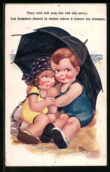 AK Verliebtes Paar in Bademode unter einem Schirm am Strand
