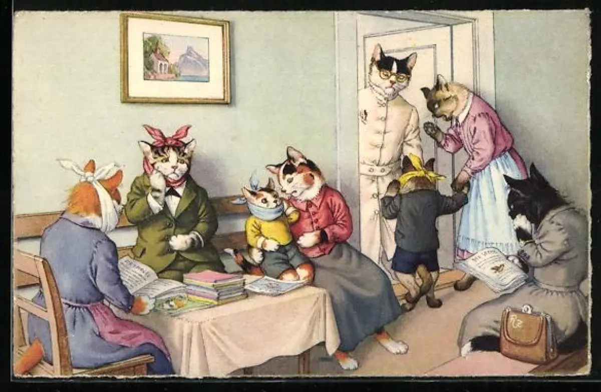 AK Vermenschlichte Katzen sitzen beim Zahnarzt im Wartezimmer