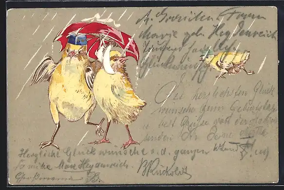 AK Vermenschlichte Osterküken unterm Regenschirm