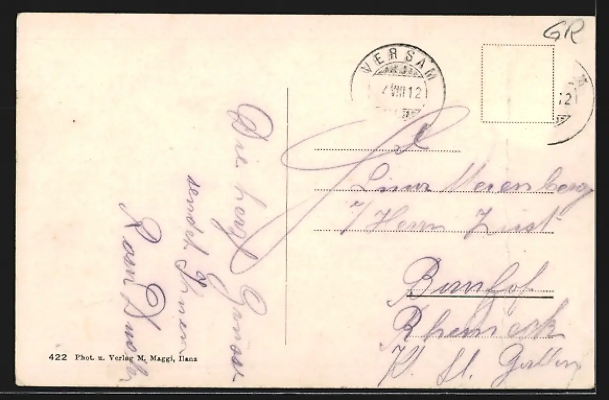 Personenbezogene Daten auf der Rückseite der Karte wurden durch blauen Textmarker unkenntlich gemacht. Die blauen Stellen sind auf die Vorderseite durchgeweicht und wirken sich negativ auf das Postkartenfoto aus