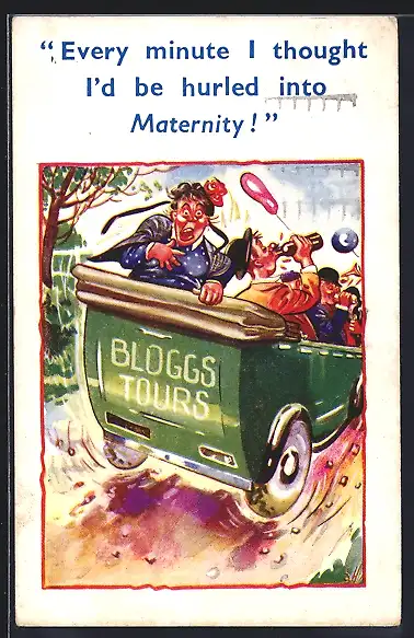 AK Verzweifelte Dame in lustiger Reisegesellschaft hat Angst geschwängert zu werden