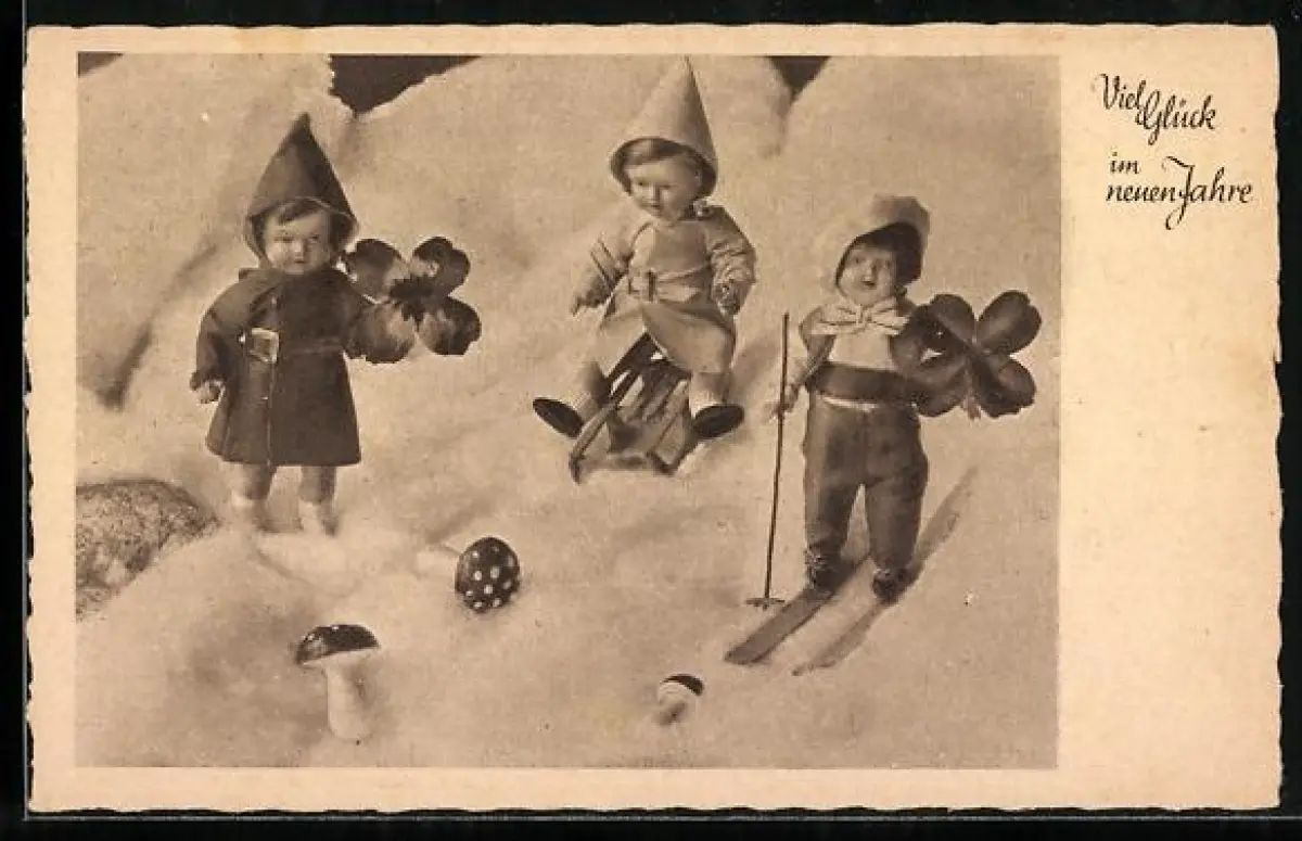 AK Viel Glück im neuen Jahre, Käthe Kruse-Puppen mit Skiern und Schlitten