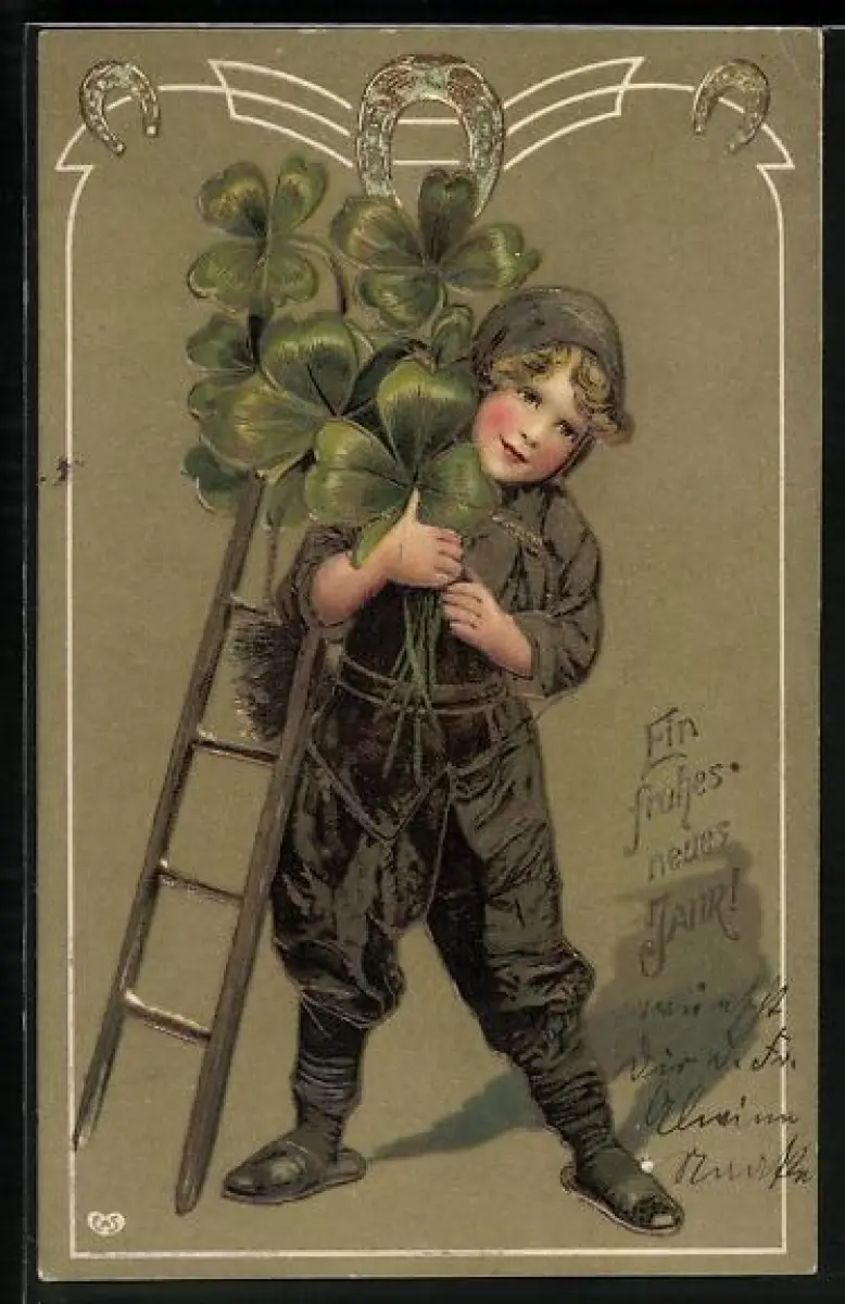 AK Viel Glück im neuen Jahre, Kleiner Schornsteinfeger mit Klee
