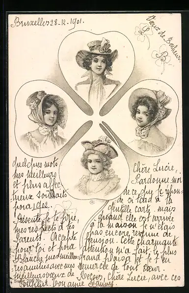 AK Vier Frauenportraits in einem Kleeblatt, Jugendstil