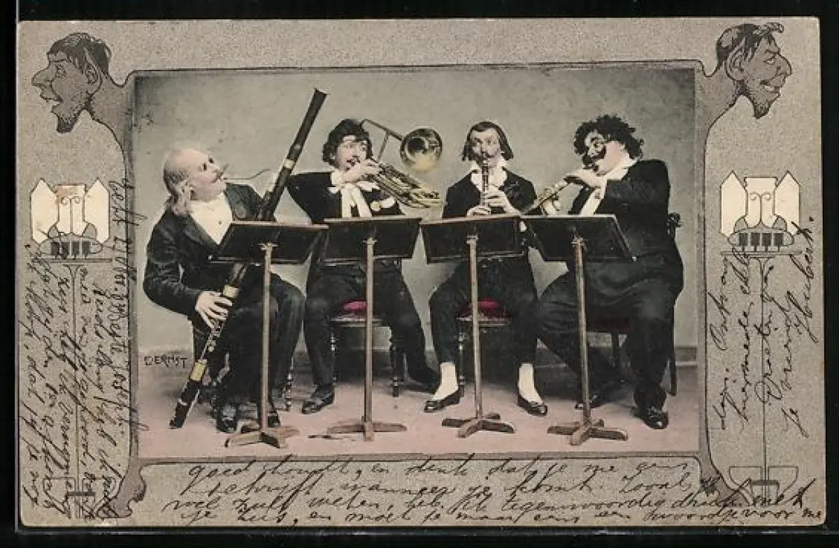 AK Vier Musiker mit Blasinstrumenten, Teufel, Passepartout