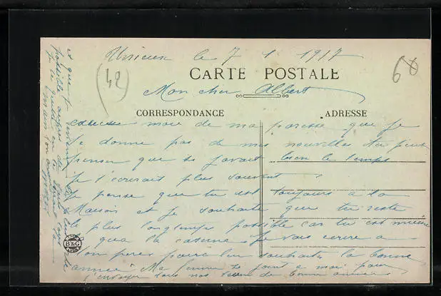 Personenbezogene Daten auf der Rückseite der Karte wurden durch blauen Textmarker unkenntlich gemacht. Die blauen Stellen sind auf die Vorderseite durchgeweicht und wirken sich negativ auf das Postkartenfoto aus