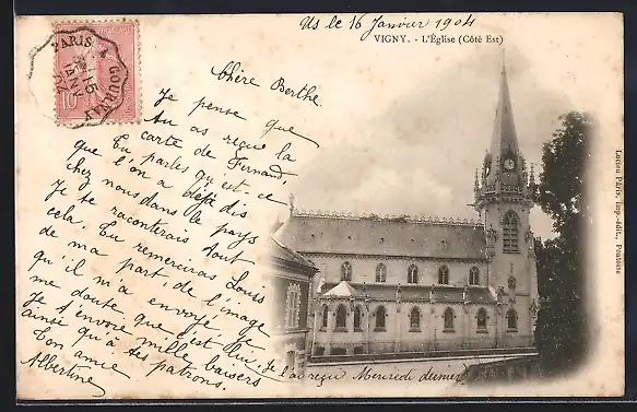 AK Vigny, L`église (Côté Est) avec écriture manuscrite du 16 janvier 1904