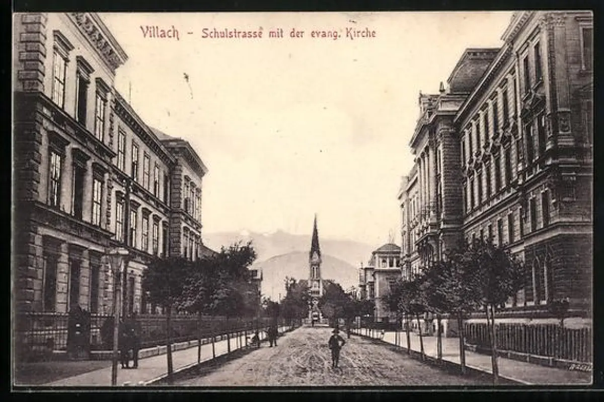 AK Villach, Schulstrasse mit Staatsbahn-Direktion und Gymnasium