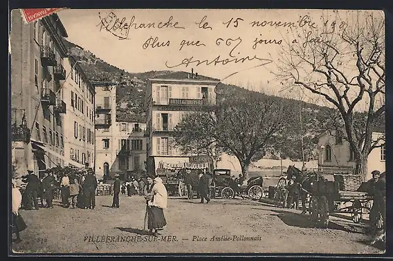 AK Villefranche-sur-Mer, Place Amélie-Pollonnais animée avec passants et calèches