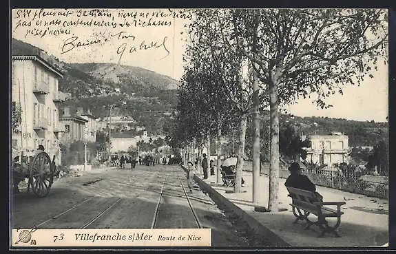AK Villefranche-sur-Mer, Route de Nice animée avec passants et charrette