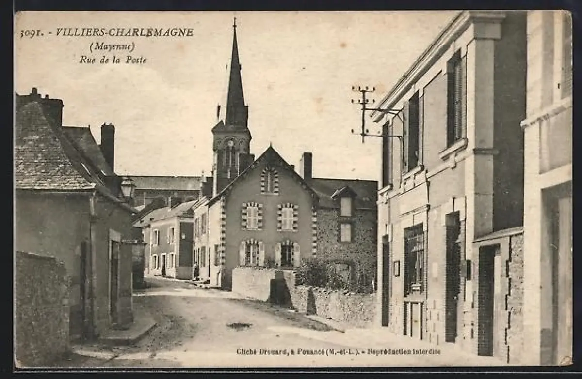 AK Villiers-Charlemagne /Mayenne, Rue de la Poste avec église et bâtiments environnants