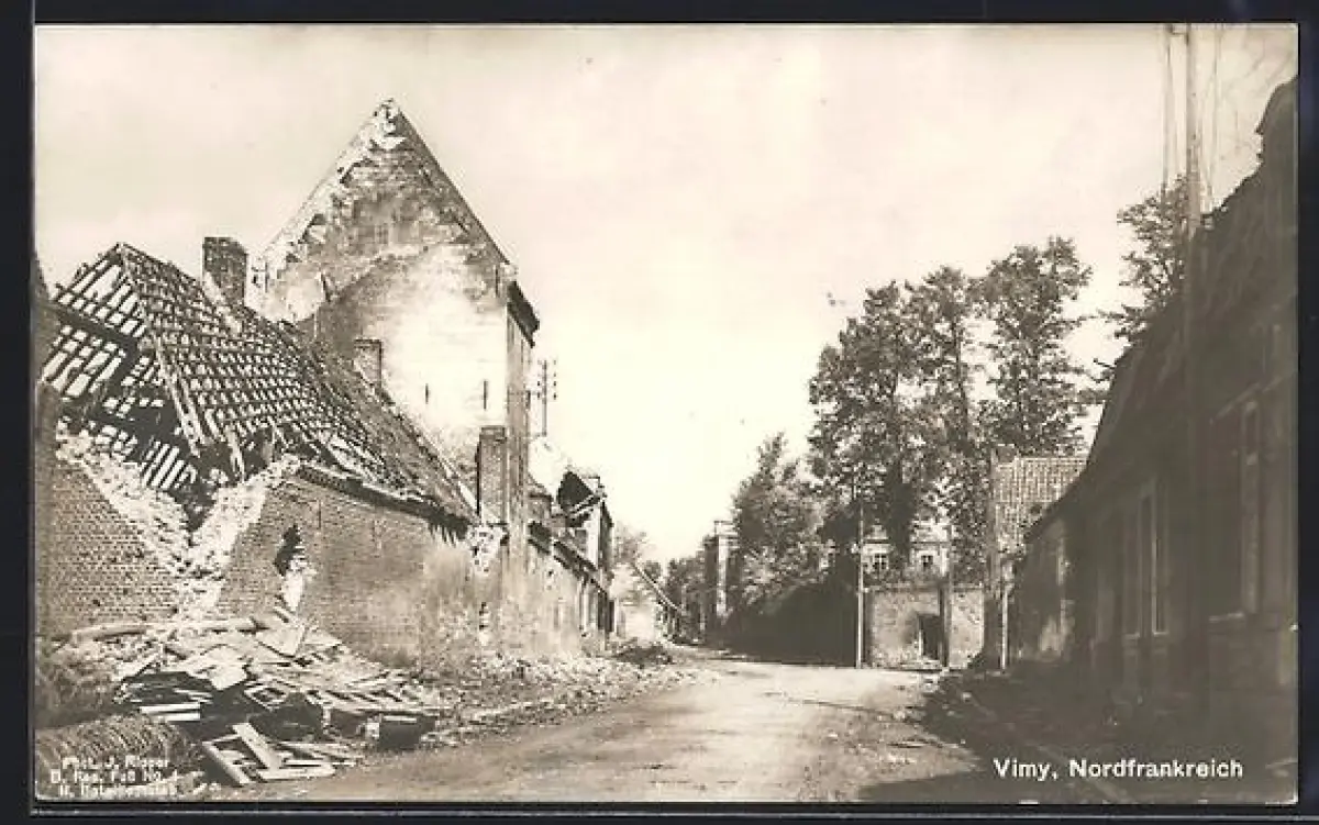 AK Vimy, Rue avec bâtiments en ruines après des bombardements