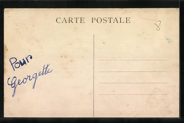 Personenbezogene Daten auf der Rückseite der Karte wurden durch blauen Textmarker unkenntlich gemacht. Die blauen Stellen sind auf die Vorderseite durchgeweicht und wirken sich negativ auf das Postkartenfoto aus